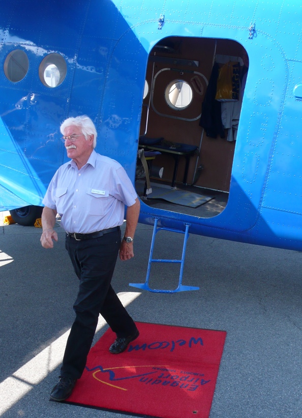 Pilot Bruno Kugler wird mit dem roten Teppich empfangen.